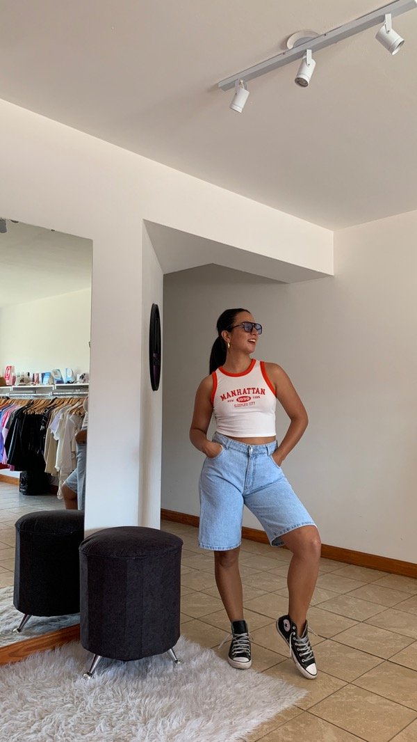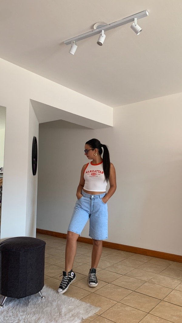Bermuda de jeans color celeste, lisa. Rígida. Tiro alto. Excelente calce.
