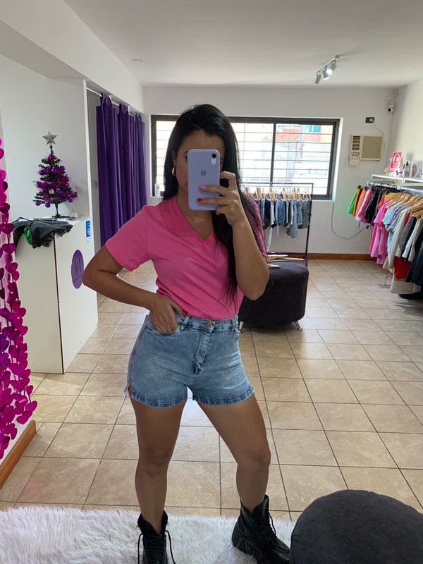 Short de jeans color celeste oscuro, liso con abertura a los costados. Elastizado. Tiro alto. Excelente calce.
