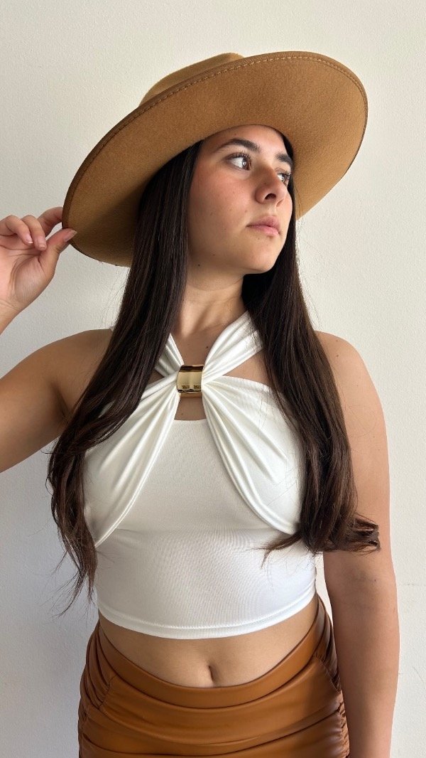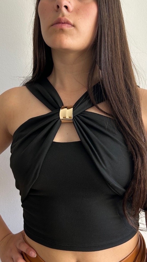 Top de microfibra liso con moño cruzado delantero y con aplique dorado en el medio.
