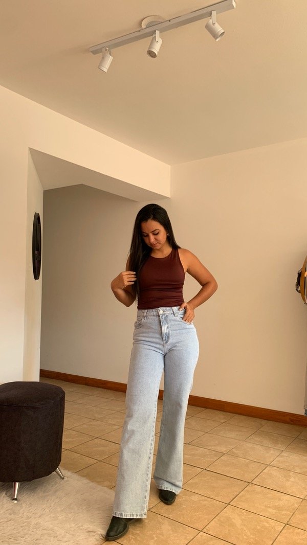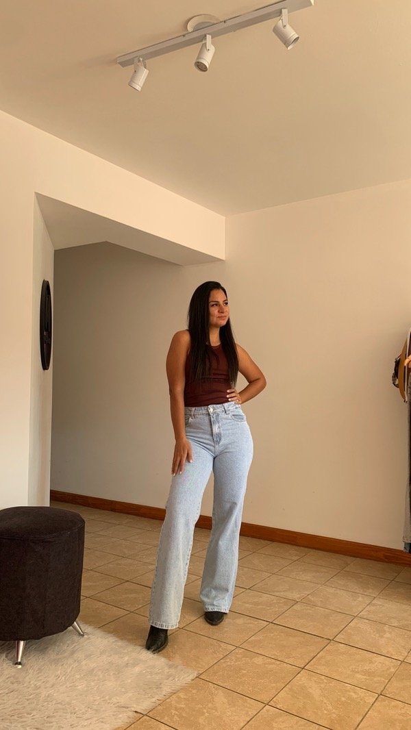 Jeans mom liso, color celeste. Rígido. Elastizado. Tiro alto.