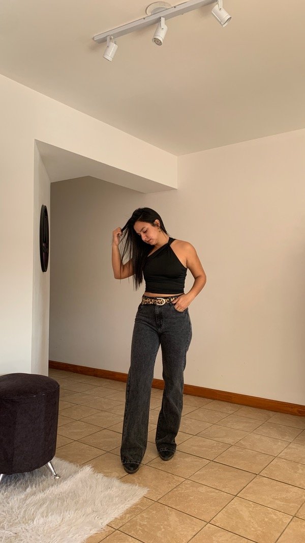 Jeans mom color gris, liso. Rígido. Tiro alto. Excelente calce.