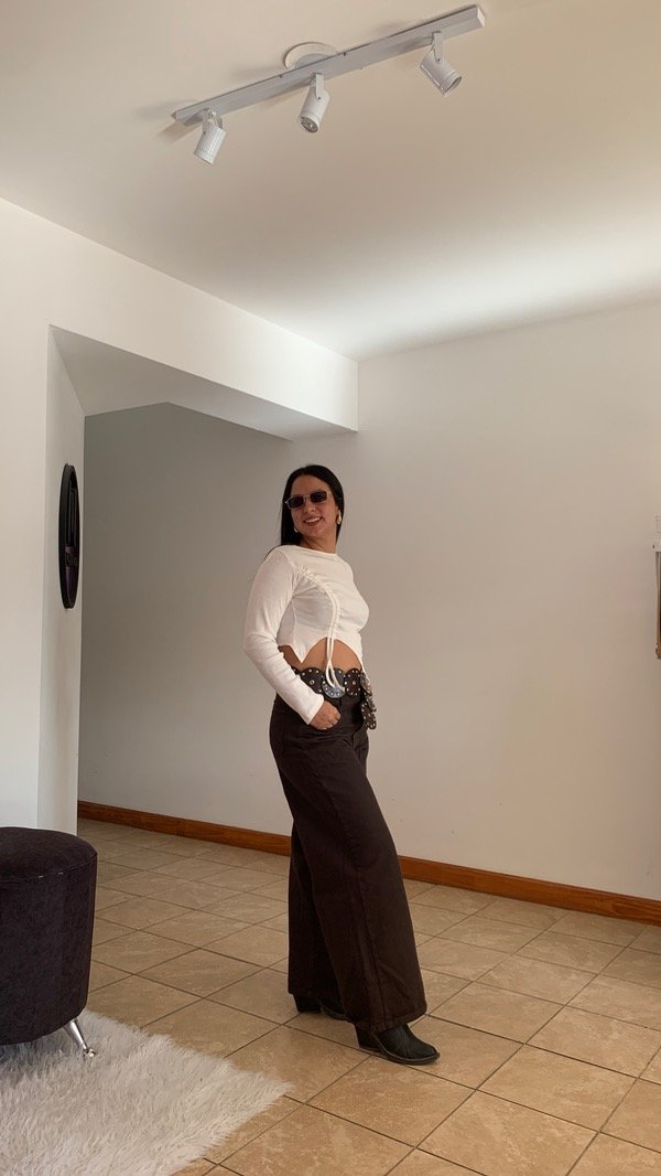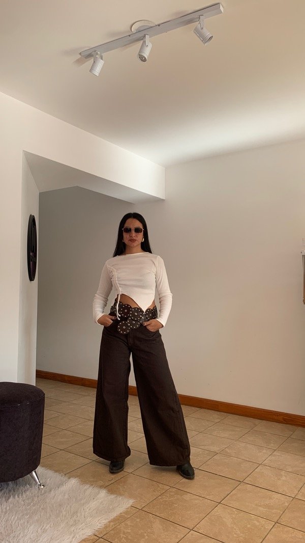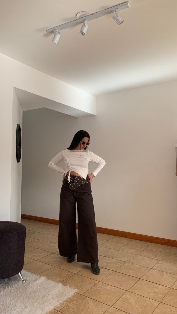 Jeans wide leg color marrón, liso. Rígido. Tiro alto. Excelente calce.